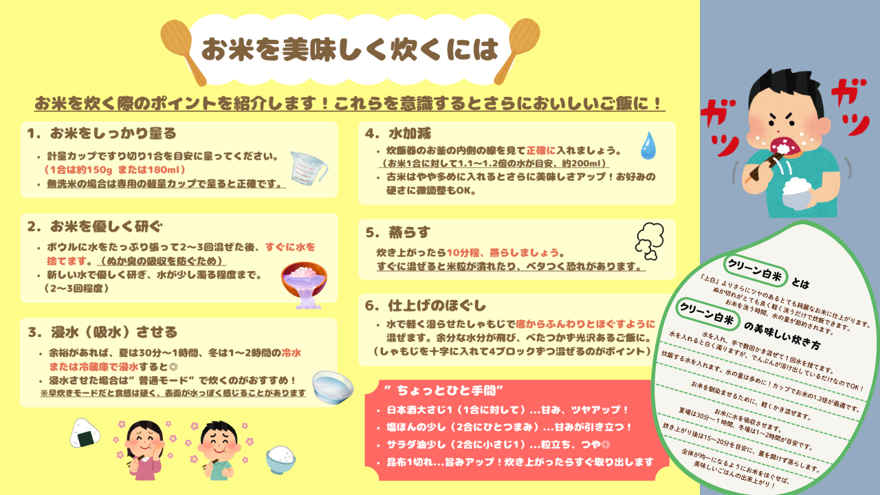 さらに、「美味しく炊くコツ」もまとめて一緒にお渡ししました!