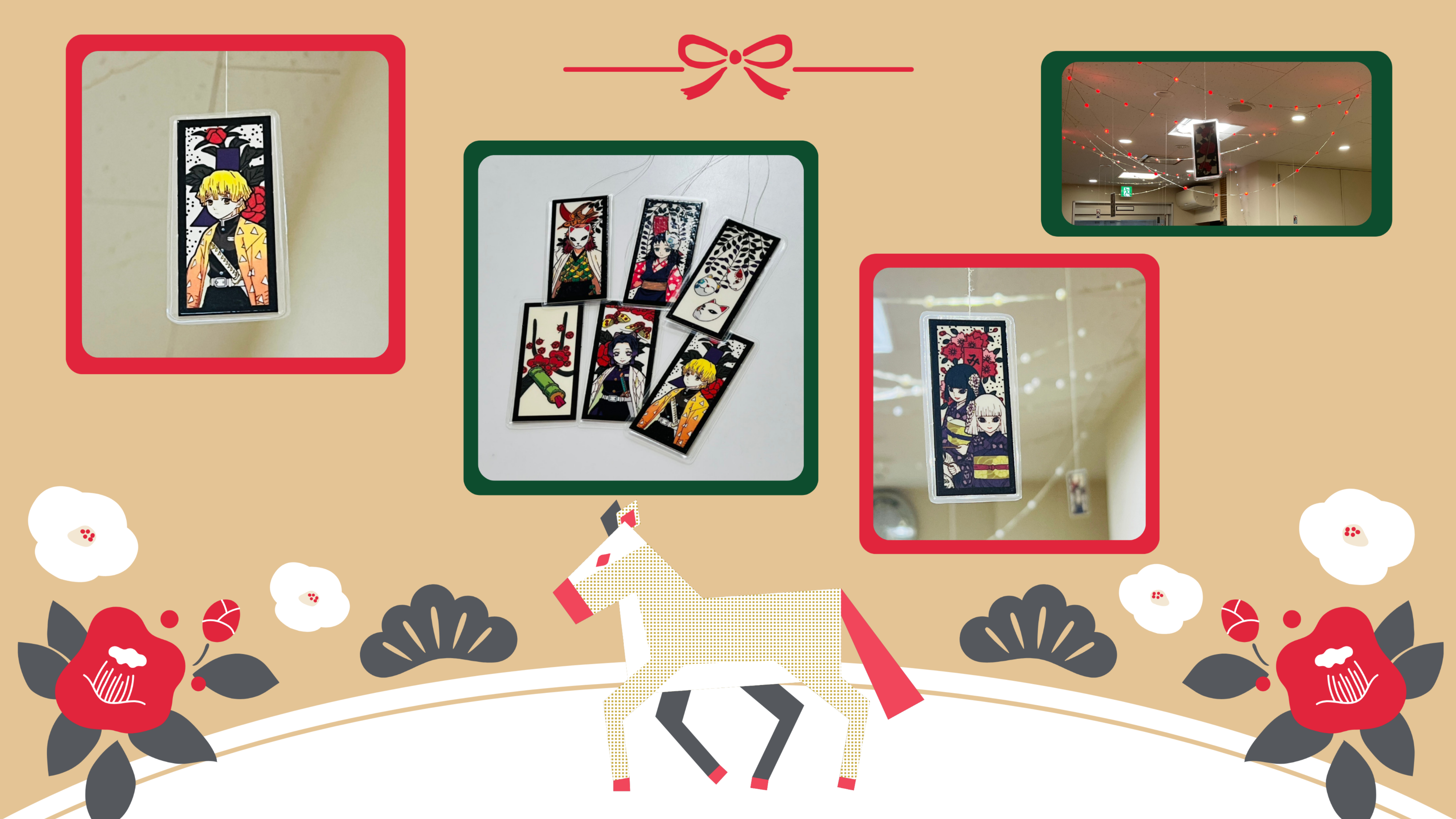 玄関エリアの天井には、鬼滅の刃の〘 花札 〙を吊るしてみました~🐗🦌🦋